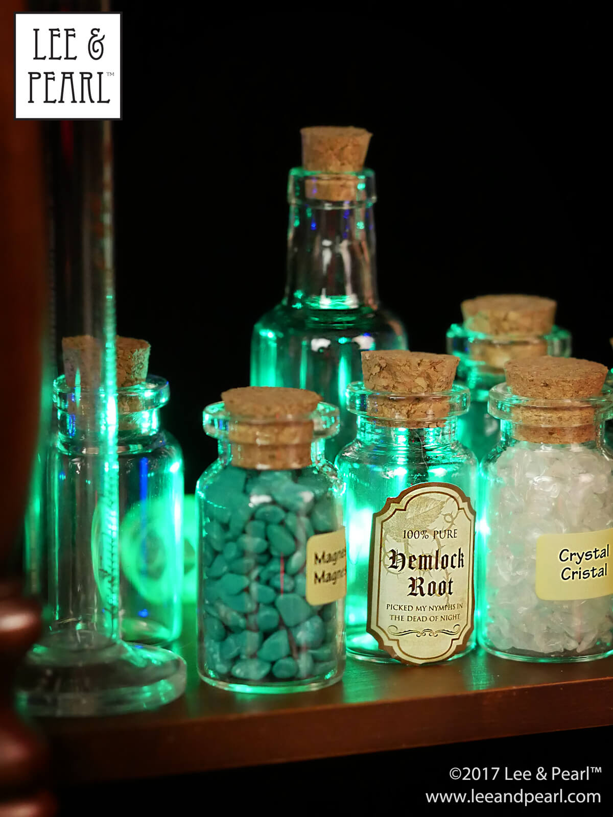 We tucked red, blue and green finger lights behind the glass bottles on the shelves, and in the drawer unit and behind larger objects on the lab table.