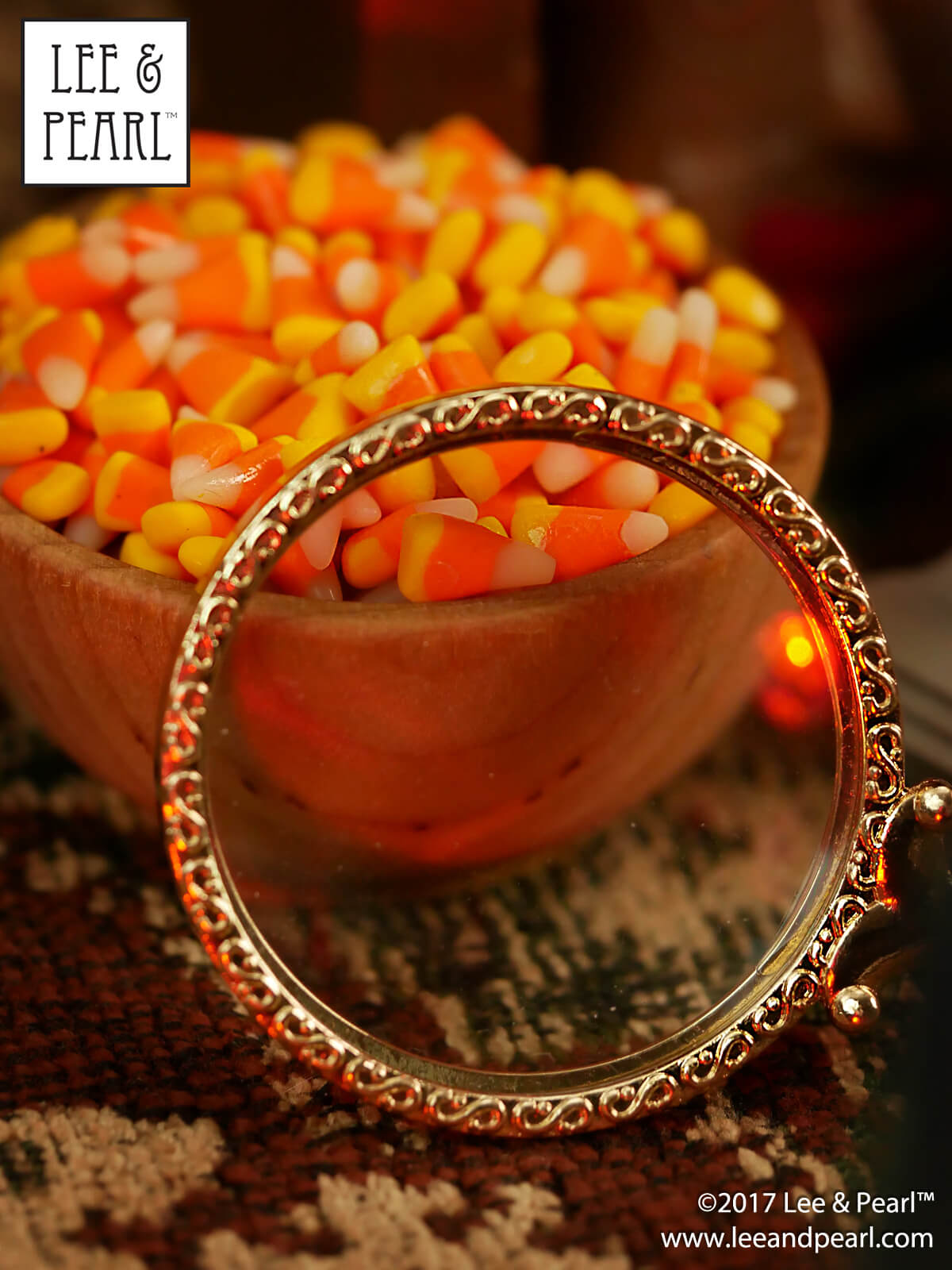 Here's our poly clay candy corn in a wooden condiment bowl, viewed through a magnifying glass pendant we found in the craft store jewelry aisle. Mmmm... now we're getting hungry, too.
