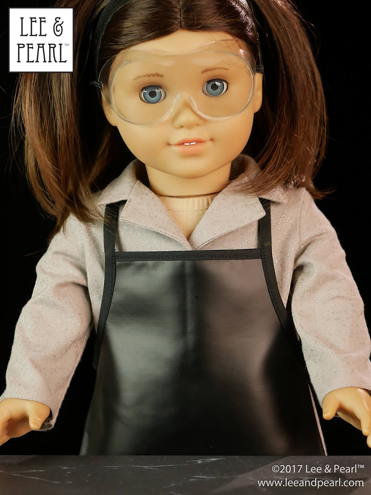 We added a black vinyl apron to Chrissa's outfit, which we made using the easy chef's apron pattern from Lee & Pearl Pattern 1033: Bonjour Paris Mini Wardrobe for 18 Inch Dolls.