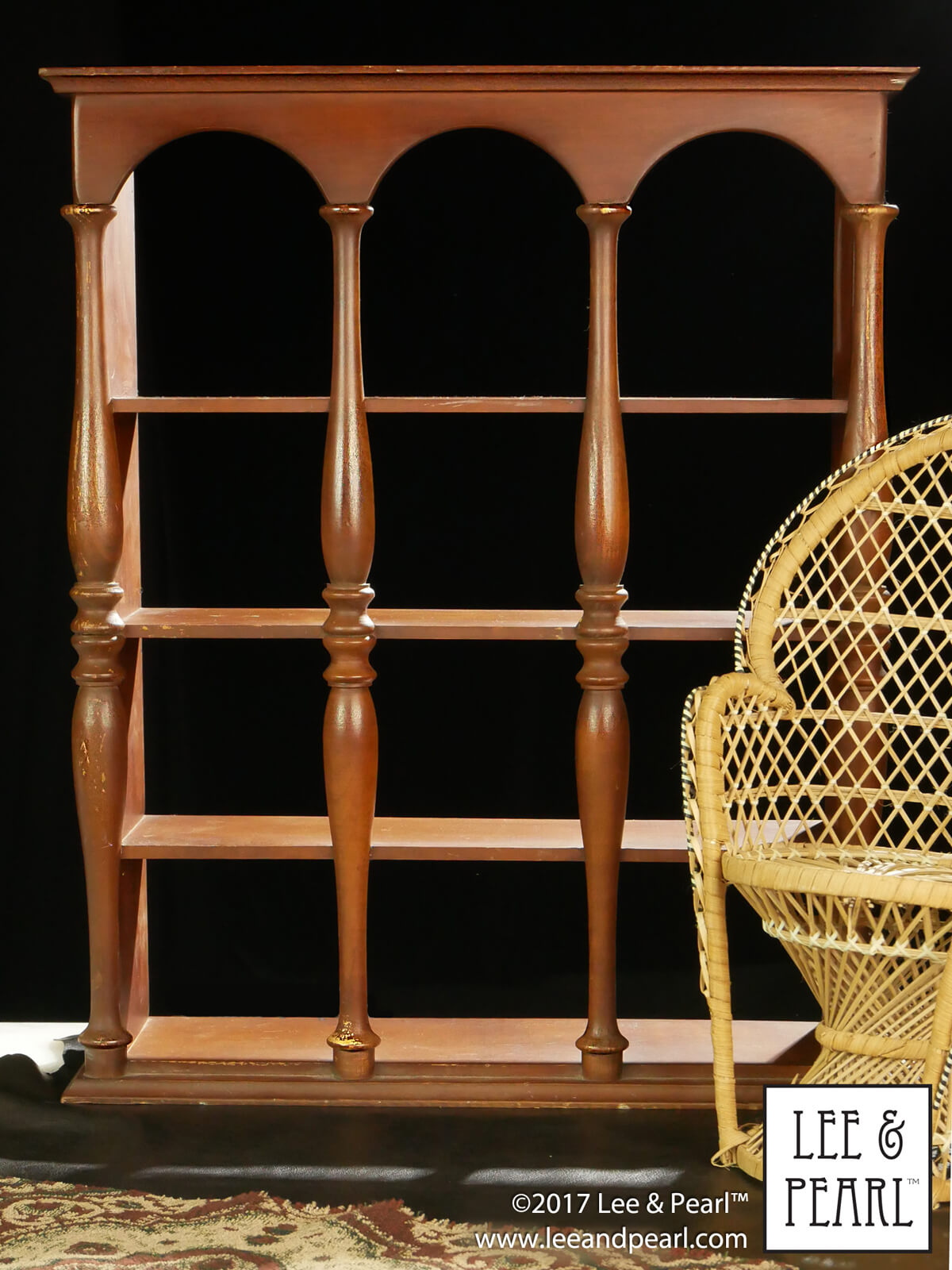 We considered thimble and shot glass display cases on Amazon but wound up finding the perfect curio shelf unit in a local antiques mall. It was a little more expensive than we'd hoped, but still a full order of magnitude less than, say, Caroline's Parlor from American Girl®. Plus, it's solid wood and it polished up beautifully.