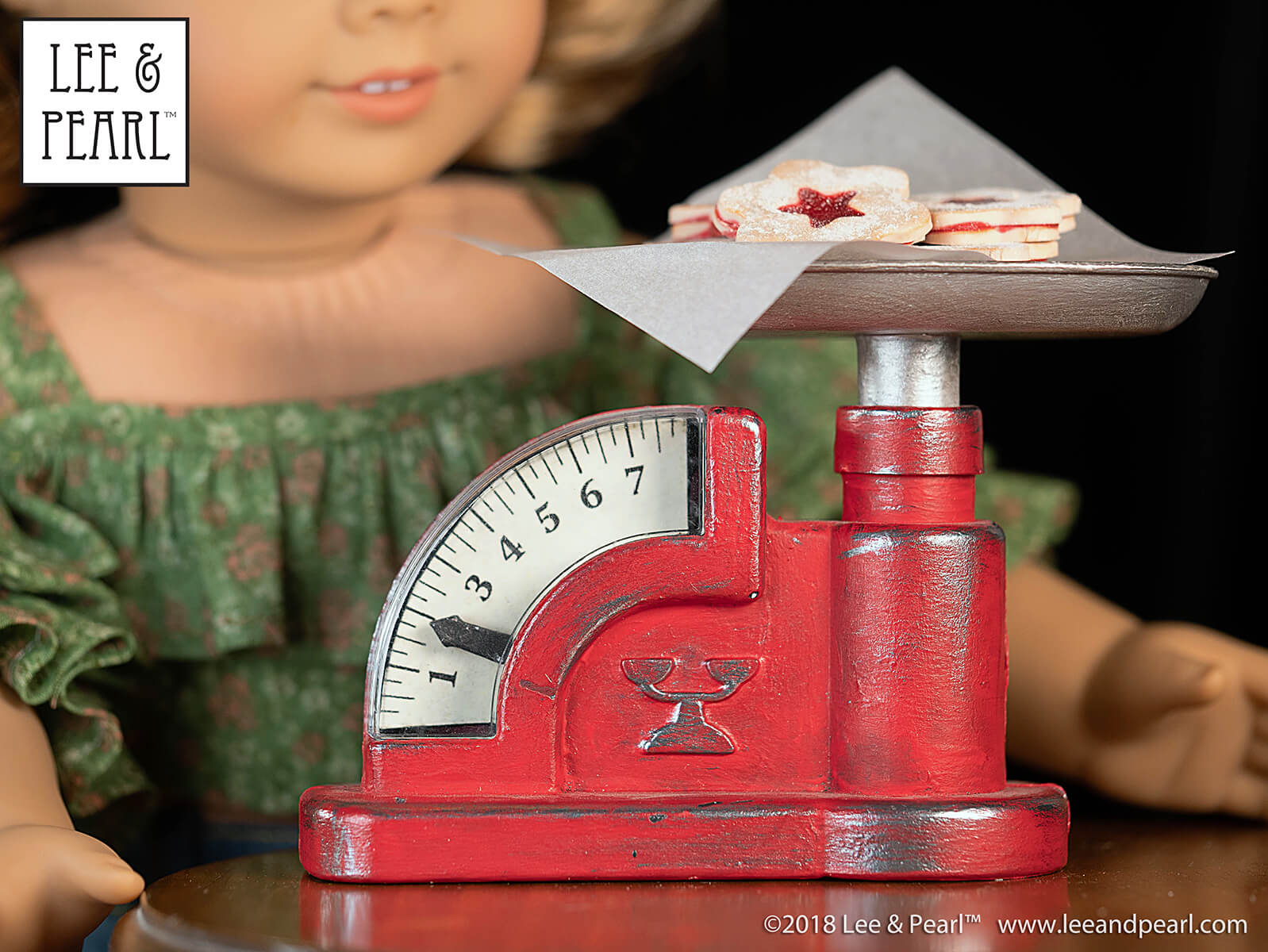 We love our antique-look scale for American Girls Kit or Nanea. We also think that the red is perfect for holiday displays and made that little stack of poly clay linzer cookies from a YouTube tutorial to go with it.